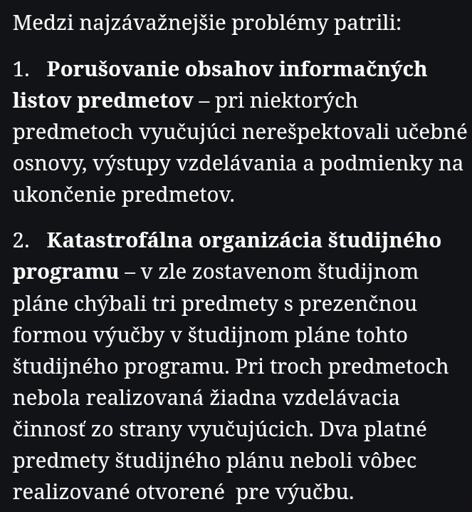 Rada študijného programu: niektorí vyučujúci nerealizovali výučbu v súlade s učebnými osnovami a na nedostatky boli upozornení.