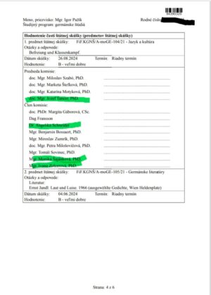Príloha: Zápis o štátnych skúškach, skutoční štyria členovia sú označení