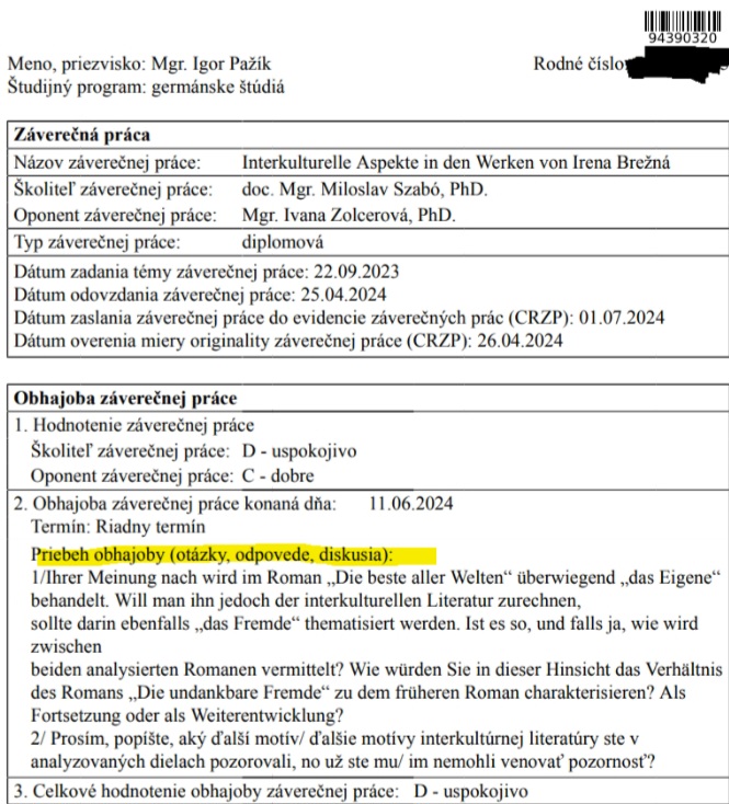 K samotným chybám posudkov sa konkrétne nevyjadril – napríklad k nedokončenej vete či preklepom, ktoré Etická rada FiF označila ako typografické nedostatky. Vyjadril ľútosť nad mojou skúsenosťou a uviedol, že vzhľadom na čiastkové informácie nevie posúdiť priebeh obhajoby.
