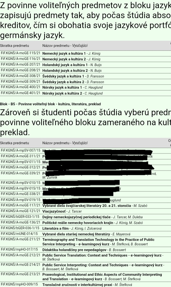 Študijný plán nemeckého modulu programu v blokoch A, B1, B4 a B5, ktorý neobsahuje žiadny praktický predmet s prezenčnou formou výučby zameraný na preklad alebo tlmočenie. Predmety švédskeho modulu sú vyčiernené.